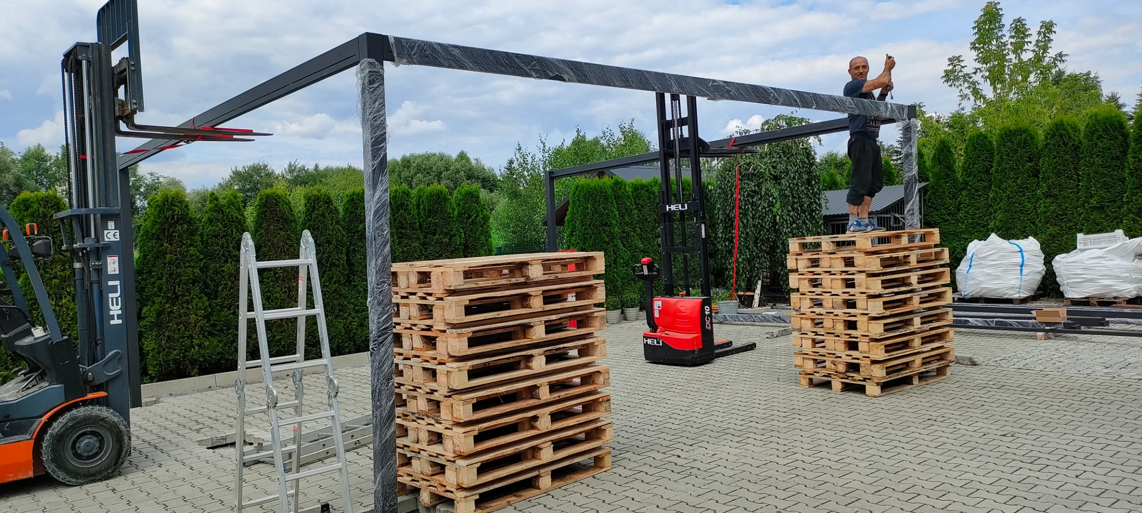 Pergola użytkowa z solidnej stali – montaż na kostce brukowej