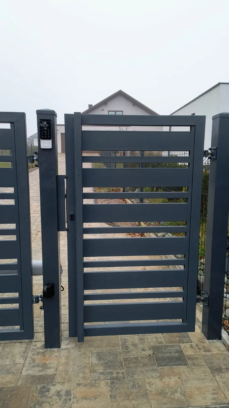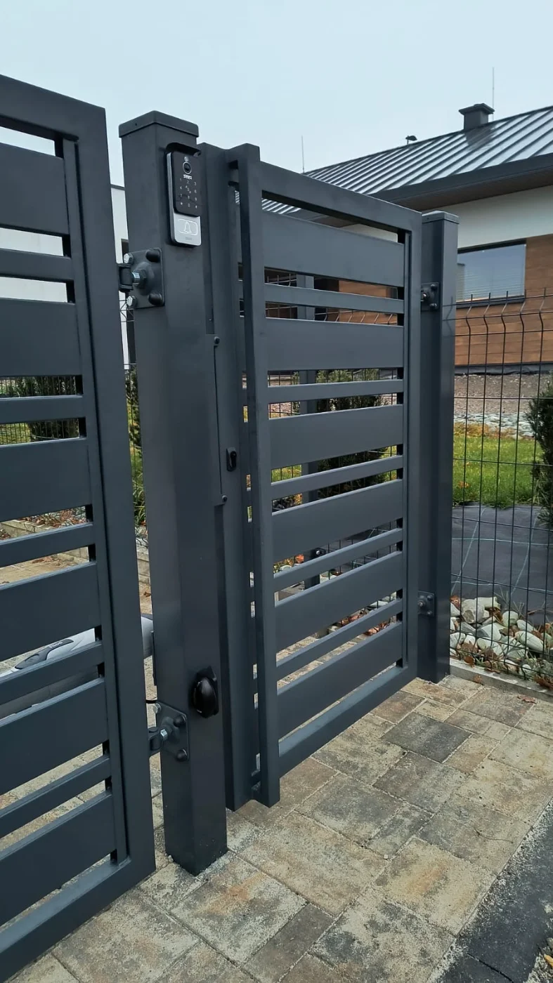Brama dwuskrzydłowa na styl mieszany w kolorze antracyt 7016, automatyka Nice oraz wideodomofon 5tech