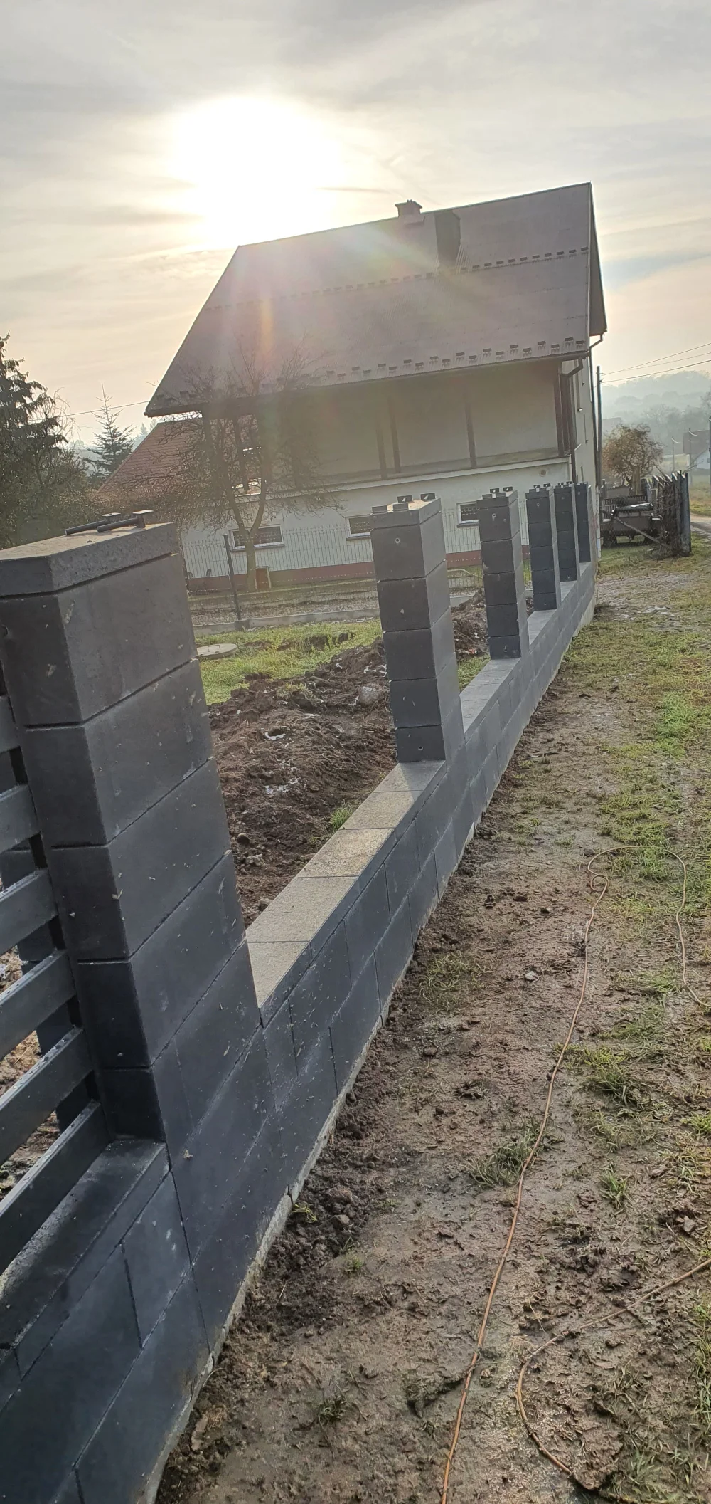 Ciemne ogrodzenie z bloczka i wypełnieniem stalowym