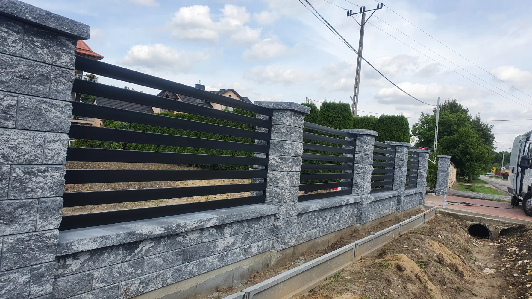 Ogrodzenie z bloczków łupanych z poziomym wypełnieniem palisadowym