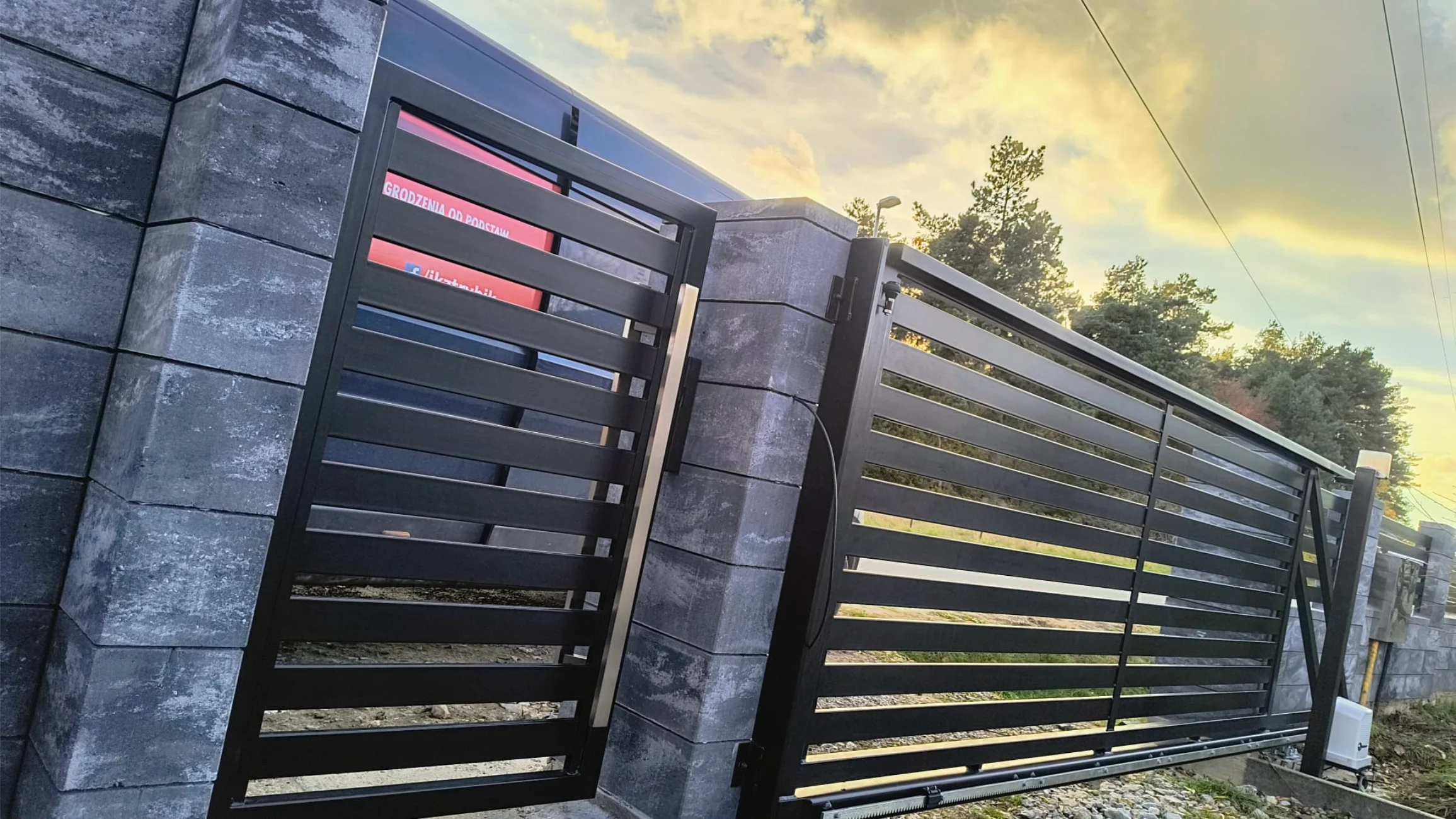 Nowoczesne ogrodzenie z bramą przesuwną i automatyką Nice